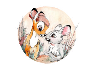 Bambi and Thumper. Painted in Pen and Watercolor. Collect this unique illustration. Printed by the artist on 100% cotton cold press heavyweight paper. The surface has a slight texture like fine art watercolor paper. This OBA-free paper is museum quality.