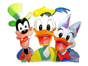Goofy, Donald, and Daisy. Painted in Pen and Watercolor. Collect this unique illustration. Printed by the artist on 100% cotton cold press heavyweight paper. The surface has a slight texture like fine art watercolor paper. This OBA-free paper is museum quality.