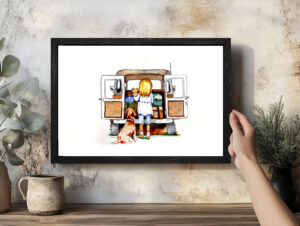 "Leaving". The artwork is a watercolor of a children's illustration—the whimsical illustration of a young girl getting ready to leave on a new journey. The prints are produced on archival heavy-weight art paper that has a slight texture. The giclee print print has very vivid colors and a deep contrast. Each print is hand signed, and limited edition with the edition number on the print, and is accompanied by a certificate of authenticity and limited edition number. Framed versions are also available. Shipping of Framed Prints is priced separately from the print price. Prints only are shipped for free. (only 25 prints will be produced of this painting).