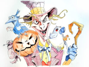 Mad Hatter Halloween-Pen and Watercolor Illustration, giclée print. Decorate your house or children's room with the spirit of the season. Print's will not fade for generations. Collect this unique illustration. Printed by the artist on 100% cotton cold press heavyweight paper. The surface has a slight texture like fine art watercolor paper. This OBA-free paper is museum quality. Prints available in 9x12, or 13x19, and matted and framed prints available for local pickup.
