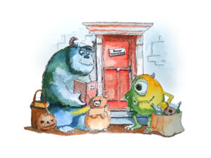 Monsters Inc Trick or Treat-Pen and Watercolor Illustration, giclée print. Decorate your house or children's room with the spirit of the season. Print's will not fade for generations. Collect this unique illustration. Printed by the artist on 100% cotton cold press heavyweight paper. The surface has a slight texture like fine art watercolor paper. This OBA-free paper is museum quality. Prints available in 9x12, or 13x19, and matted and framed prints available for local pickup.