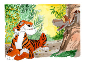 Shere Kahan and Kaa - Classic Disney from the animated movie Jungle Blook. Signed Pen and Watercolor Illustration Print. Collect this unique illustration. Printed by the artist on 100% cotton cold press heavyweight paper. The surface has a slight texture like fine art watercolor paper. This OBA-free paper is museum quality.