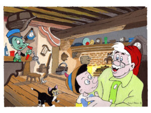 That's My Boy - Classic Disney - Pinocchio and the Clock Maker. Signed Gauche Print . Collect this unique illustration. Printed by the artist on 100% cotton cold press heavyweight paper. The surface has a slight texture like fine art watercolor paper. This OBA-free paper is museum quality.