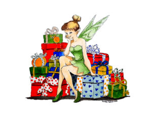 Tinkerbell Chrismas - Pen and Watercolor Illustration, giclée print. Decorate your house or children's room with the spirit of the season. Print's will not fade for generations. Collect this unique illustration. Printed by the artist on 100% cotton cold press heavyweight paper. The surface has a slight texture like fine art watercolor paper. This OBA-free paper is museum quality. Prints available in 9x12, or 13x19, and matted and framed prints available for local pickup.