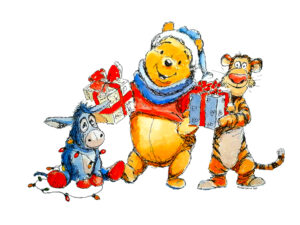 Winne the Pooh Christmas - Pen and Watercolor Illustration, giclée print. Decorate your house or children's room with the spirit of the season. Print's will not fade for generations. Collect this unique illustration. Printed by the artist on 100% cotton cold press heavyweight paper. The surface has a slight texture like fine art watercolor paper. This OBA-free paper is museum quality. Prints available in 9x12, or 13x19, and matted and framed prints available for local pickup.